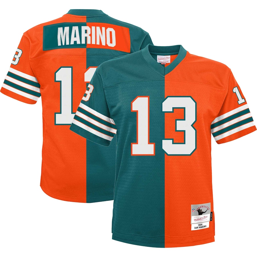 ID : Men's Miami Dolphins Dan Marino Mitchell & Ness Aqua Orange 1984 Split Legacy Replica Jersey