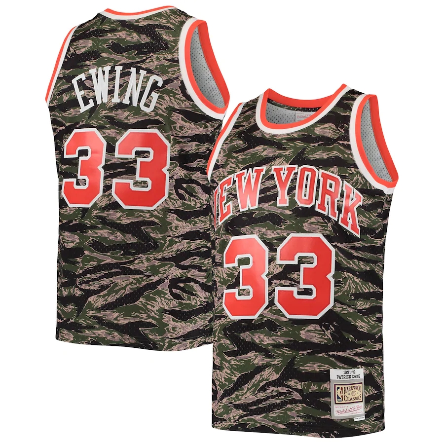 ID : Men's New York Knicks Patrick Ewing Mitchell & Ness Camo Hardwood Classics Tiger Swingman Jersey